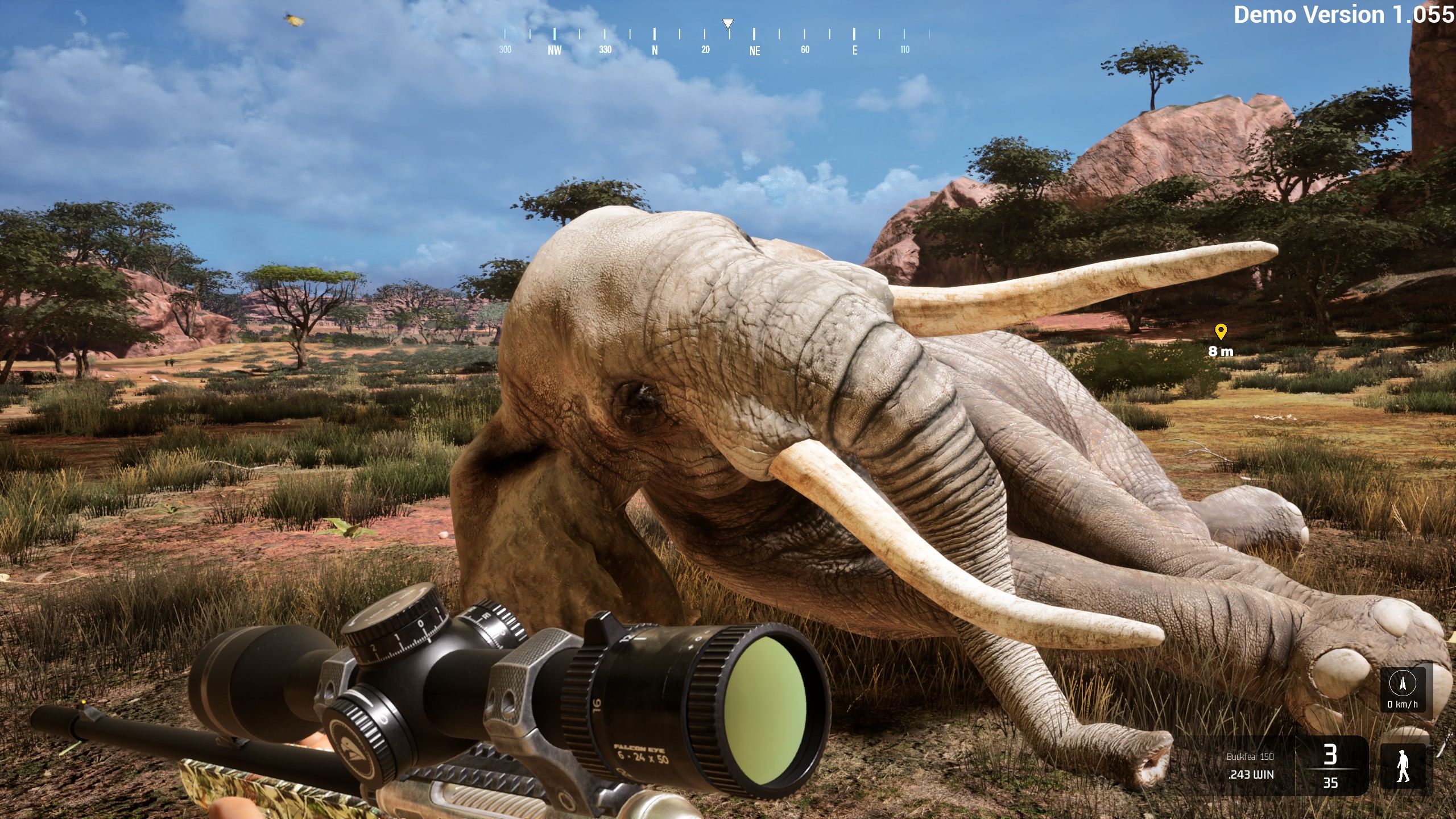 The demo focuses on core gameplay elements like exploration, tracking, and transporting harvested game. Players encounter three animal species: African elephants, Burchell’s zebras, and savanna hares. Each animal has distinct behavior and size. Players can also use one vehicle and customize their weapon, such as changing the caliber and barrel length.